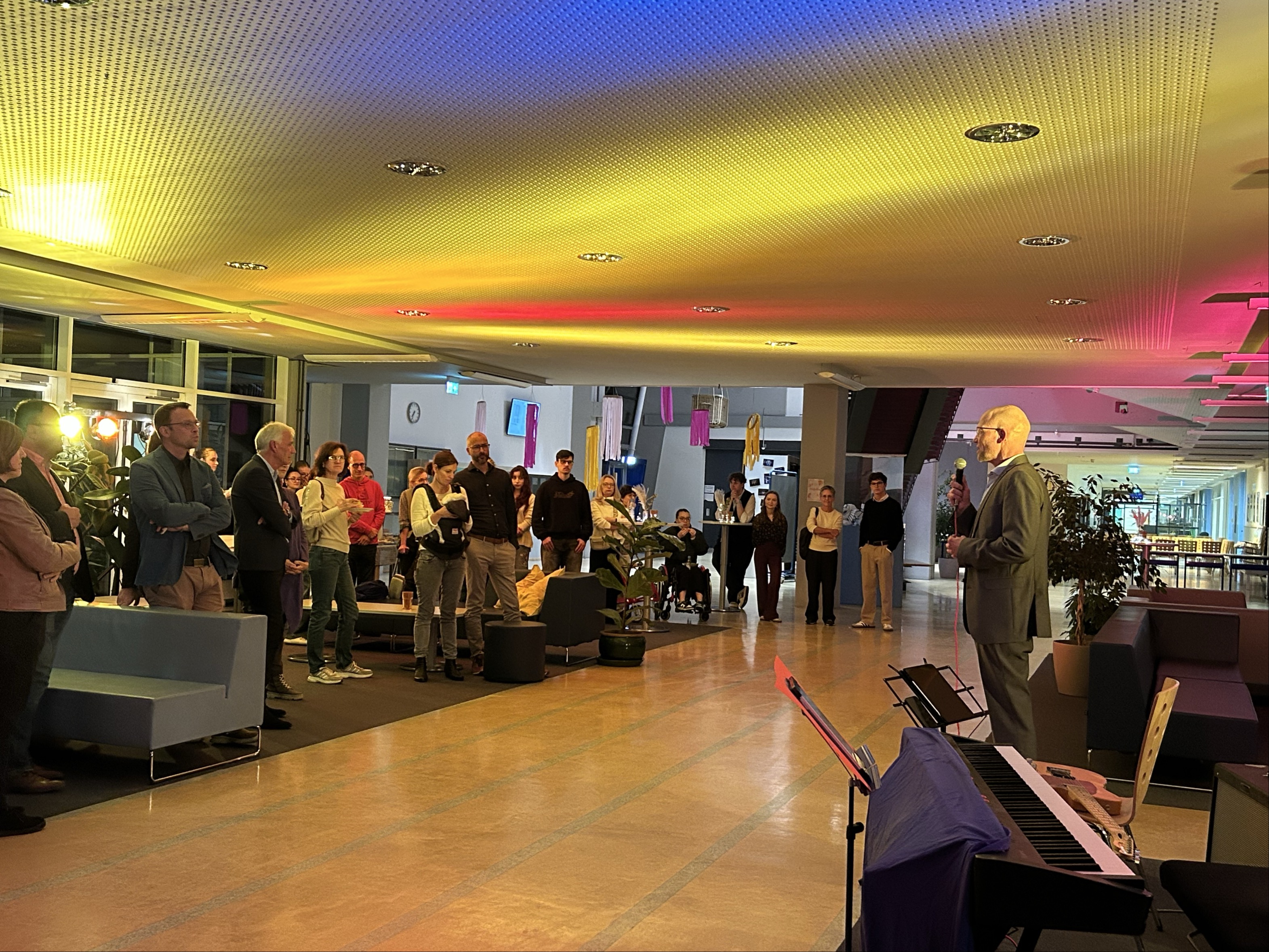 Im Namen der Q13 begrüßte Leon Gerlinger zu Beginn des Abends die Besucherinnen und Besucher und bedankte sich. Anschließend richteten Bürgermeister Lorenz Müller sowie Schulleiter Stephan Richter kurze Grußworte an die Gäste. Den musikalischen Rahmen schmückten Marwin Haas, Leon Saskovic und Simon Wittmann.