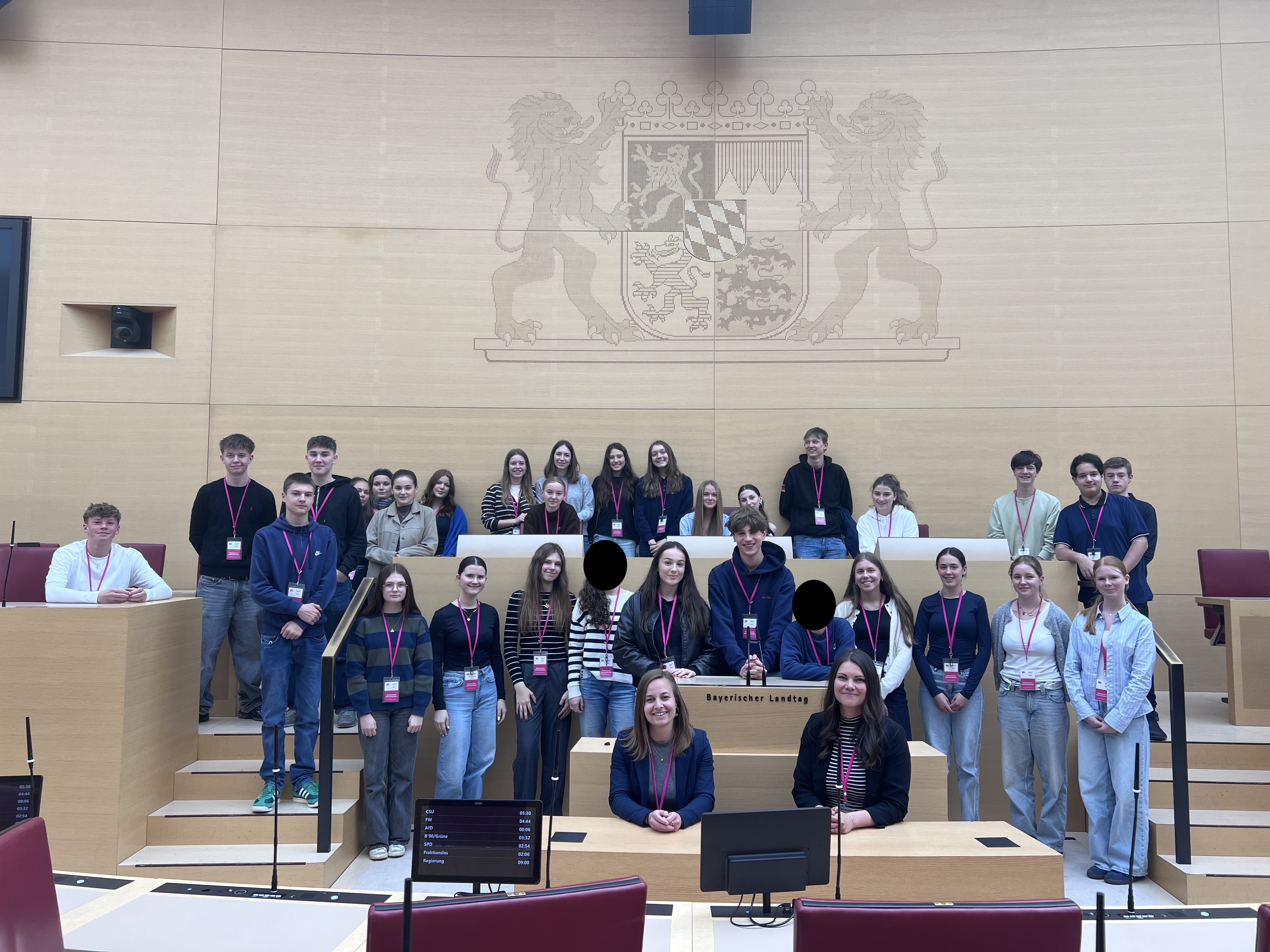 Zu Beginn stand eine typische Schülerfrage im Raum: „Ist Markus Söder heute da?“ – eine ideale Gelegenheit, um die Unterschiede zwischen Exekutive und Legislative zu klären. Schnell wurde deutlich: Als Ministerpräsident gehört Markus Söder der Exekutive an und arbeitet in der Staatskanzlei, während der Landtag als Legislative eigene Aufgaben erfüllt. Im anschließenden Vortrag erhielten die Klassen spannende Einblicke in die Zusammensetzung und Arbeitsweise des Parlaments. Dabei wurde unter anderem thematisiert, dass dort, wo Frauen zur Wahl stehen, auch Frauen gewählt werden – gleichzeitig ist ihre Beteiligung insgesamt rückläufig, während konservative Parteien an Einfluss gewinnen. Auch die Entwicklung der Altersstruktur (etwa in den Jahren 1954 und 2001) sowie die Vielfalt der vertretenen Berufsgruppen wurden thematisiert. Ein besonderes Highlight war die Teilnahme an zwei Ausschusssitzungen. Hier konnten die Schülerinnen und Schüler politische Entscheidungsprozesse live miterleben. Im anschließenden Gespräch mit den Abgeordneten Caroline Trautner (CSU) und Maximilian Deisenhofer stellten die Schülerinnen und Schüler zahlreiche interessierte Fragen: zum persönlichen Werdegang der Politikerinnen und Politiker, zum Frauenanteil im Landtag, zum Wahlalter ab 16 oder auch zu aktuellen gesellschaftlichen Themen wie der Debatte um Windräder. Besonders einig war sich die Gruppe bei der Frage nach der Regulierung sozialer Medien – hier sprachen sich alle für eine stärkere Kontrolle für Jugendliche aus. Auch Programme wie „Bavaria ruft“ oder der Girls’ Day wurden vorgestellt und verdeutlichten, wie vielfältig die Möglichkeiten für junge Menschen sind, sich politisch und gesellschaftlich zu engagieren. Deisenhofer machte dabei deutlich: Für diese Generation stehen viele Türen offen – in einem friedlichen Land, das Chancen bietet und keinen Anlass für Resignation gibt. Abgerundet wurde der Tag durch eine historische Führung durch das Landtagsgebäude sowie ein gemeinsames Mittagessen.