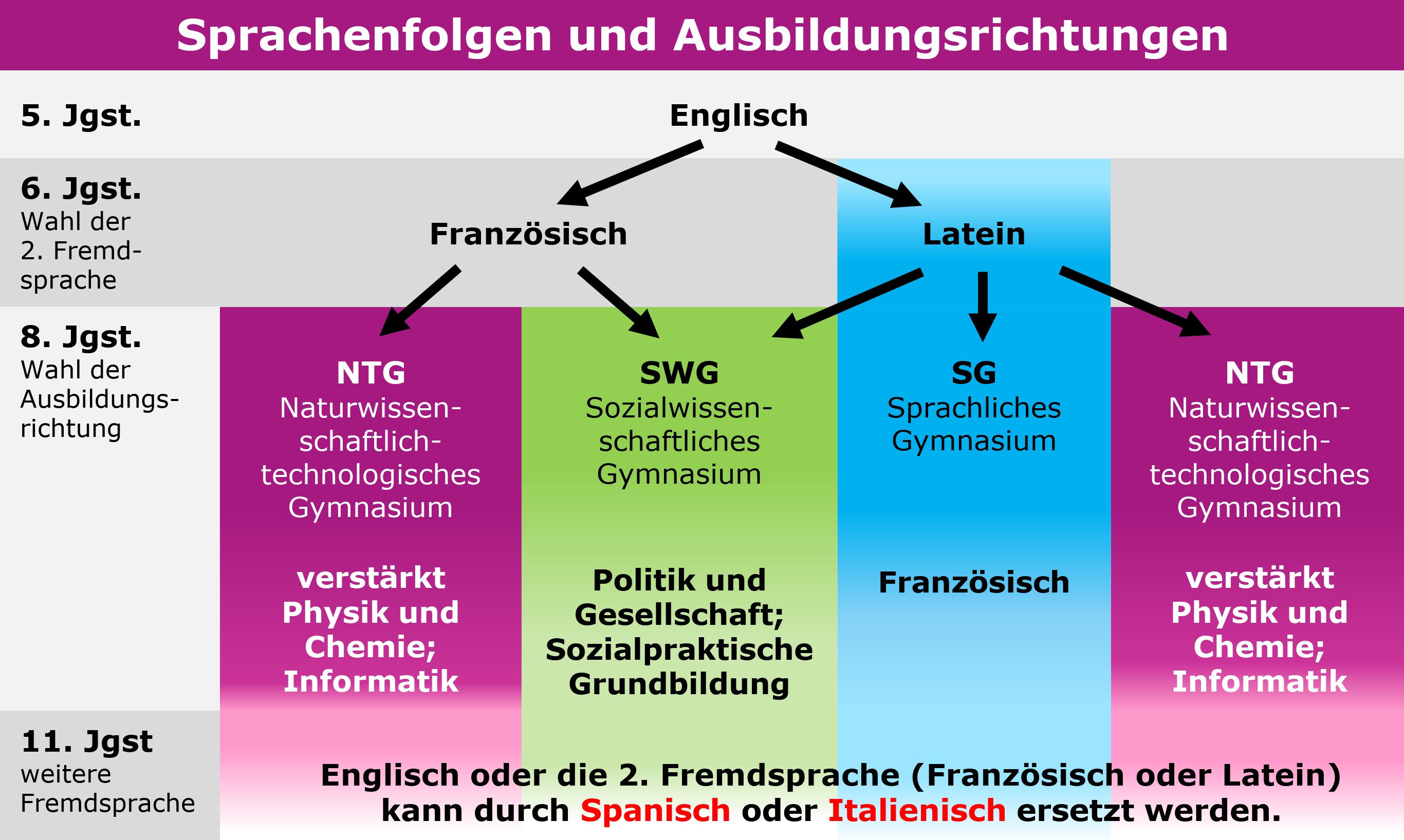 Die Wahl der Fremdsprachen ist eng mit der Wahl der Ausbildungsrichtung verknüpft. Das Schaubild soll Ihnen einen kurzen Überblick hierüber geben. Ausführliche Informationen erhalten Sie bei den entsprechenden Elternabenden.