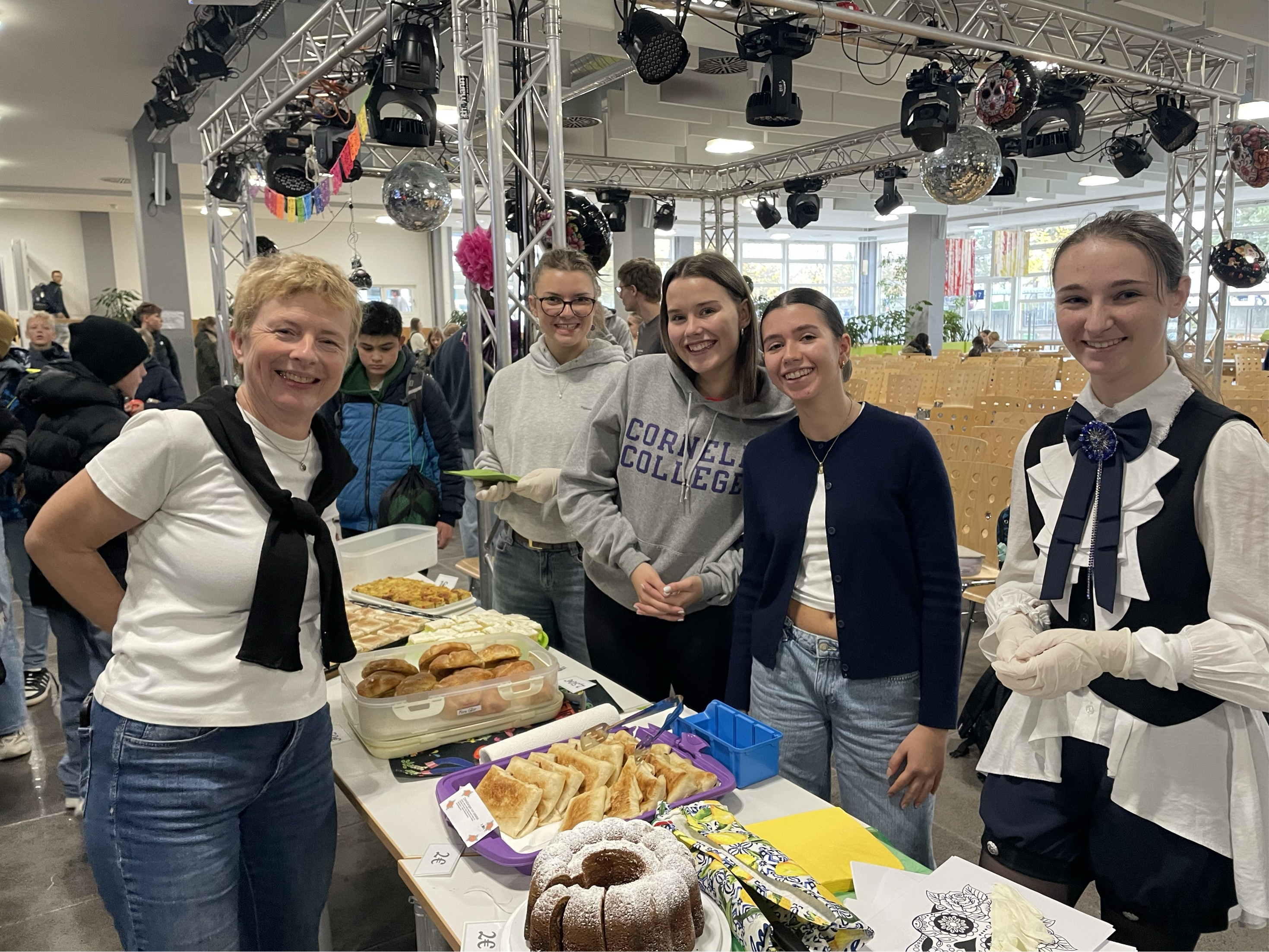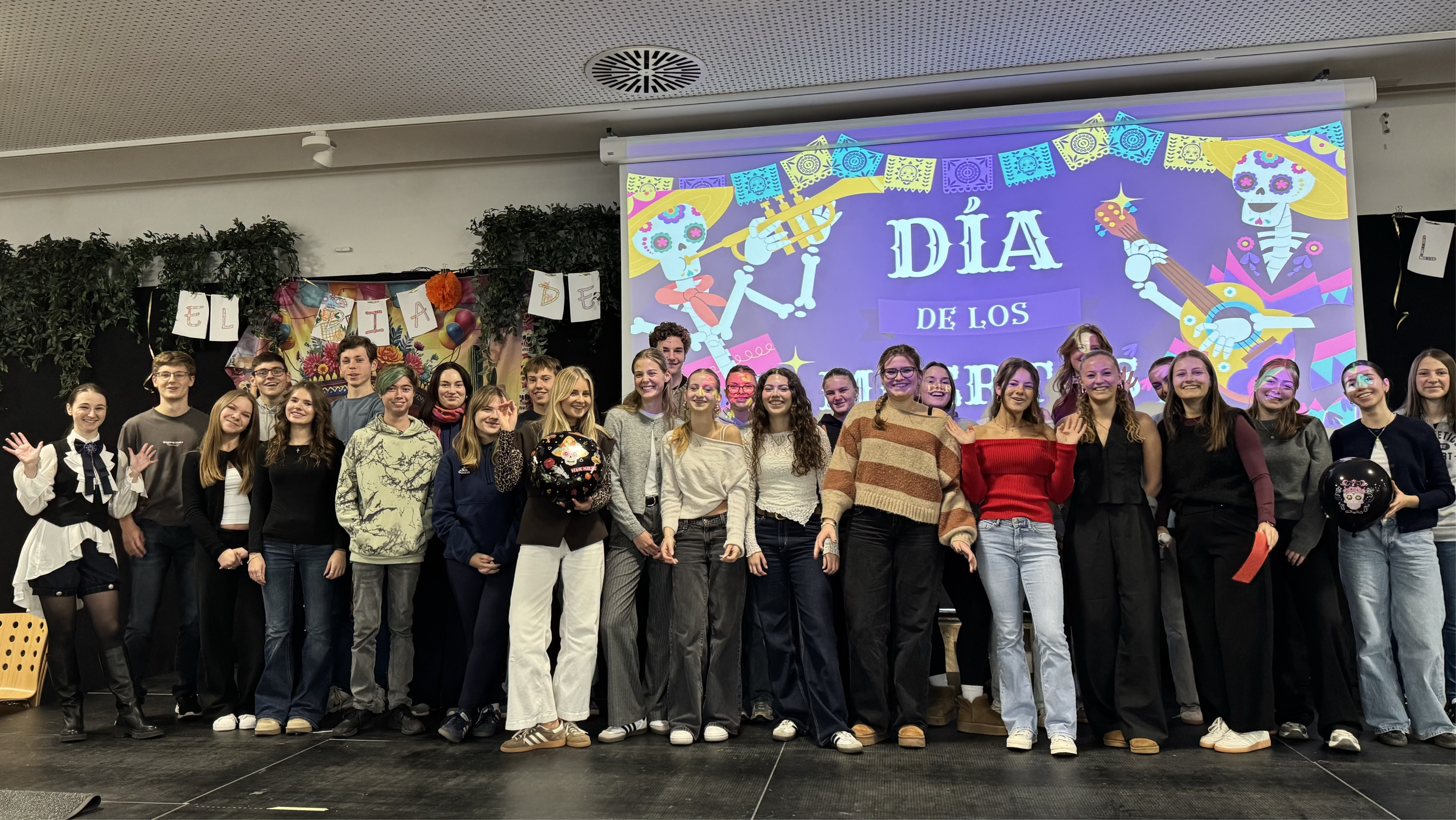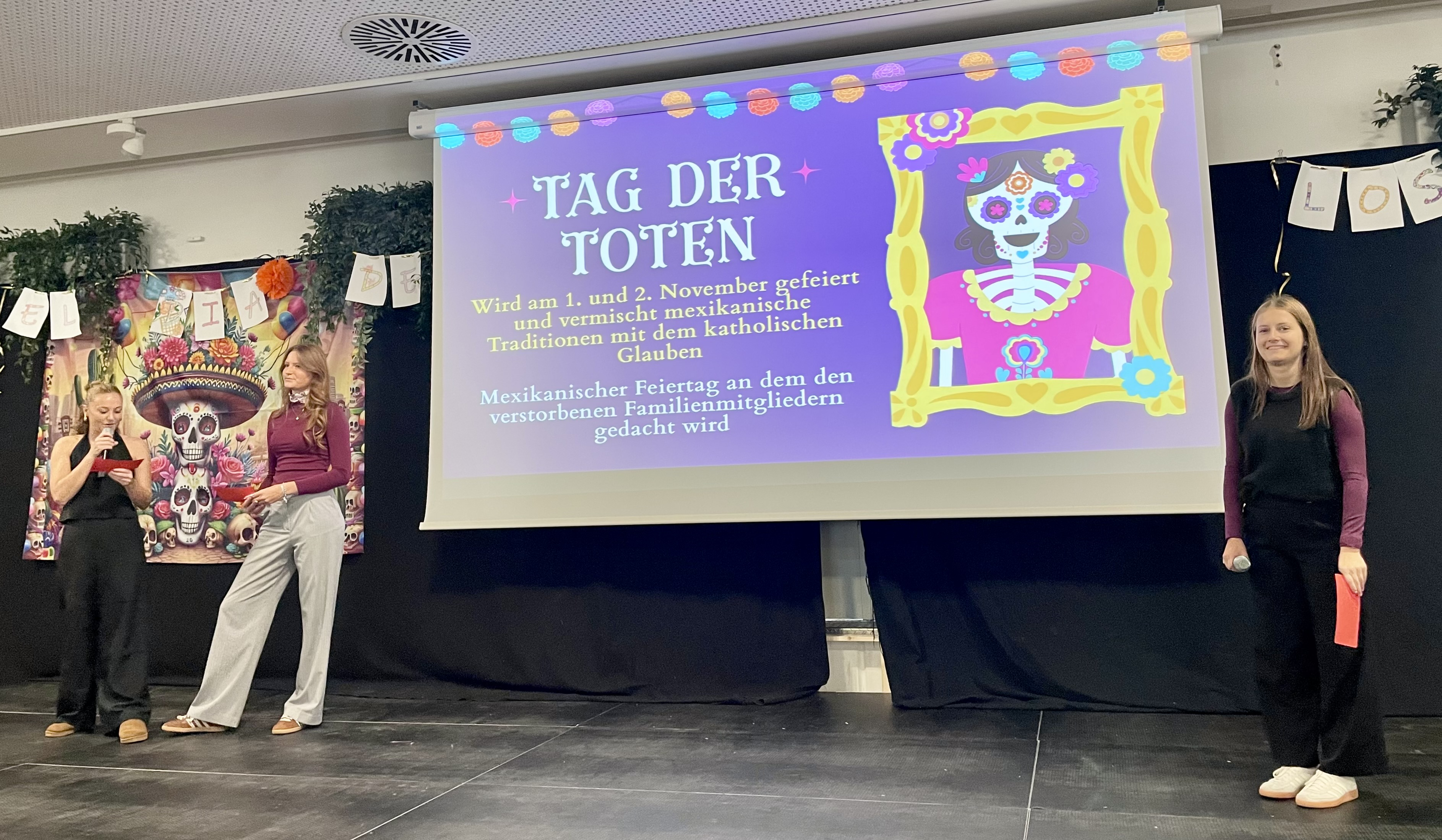 Aus diesem Anlass hat der Spanischkurs der Q12 eine kleine Pausenaktion vorbereitet. Die gesamte Mensa war farbenfroh und dem Anlass entsprechend dekoriert und mexikanische Musik lud uns alle auf eine Reise nach Mexiko ein. Für das leibliche Wohl war dank pan de muertos, tortillas, tres leches und vielen weiteren Köstlichkeiten gesorgt. Im Anschluss an eine farbenfrohe Präsentation konnten alle ihr Wissen über diese mexikanische Tradition mit einem Kreuzworträtsel unter Beweis stellen!