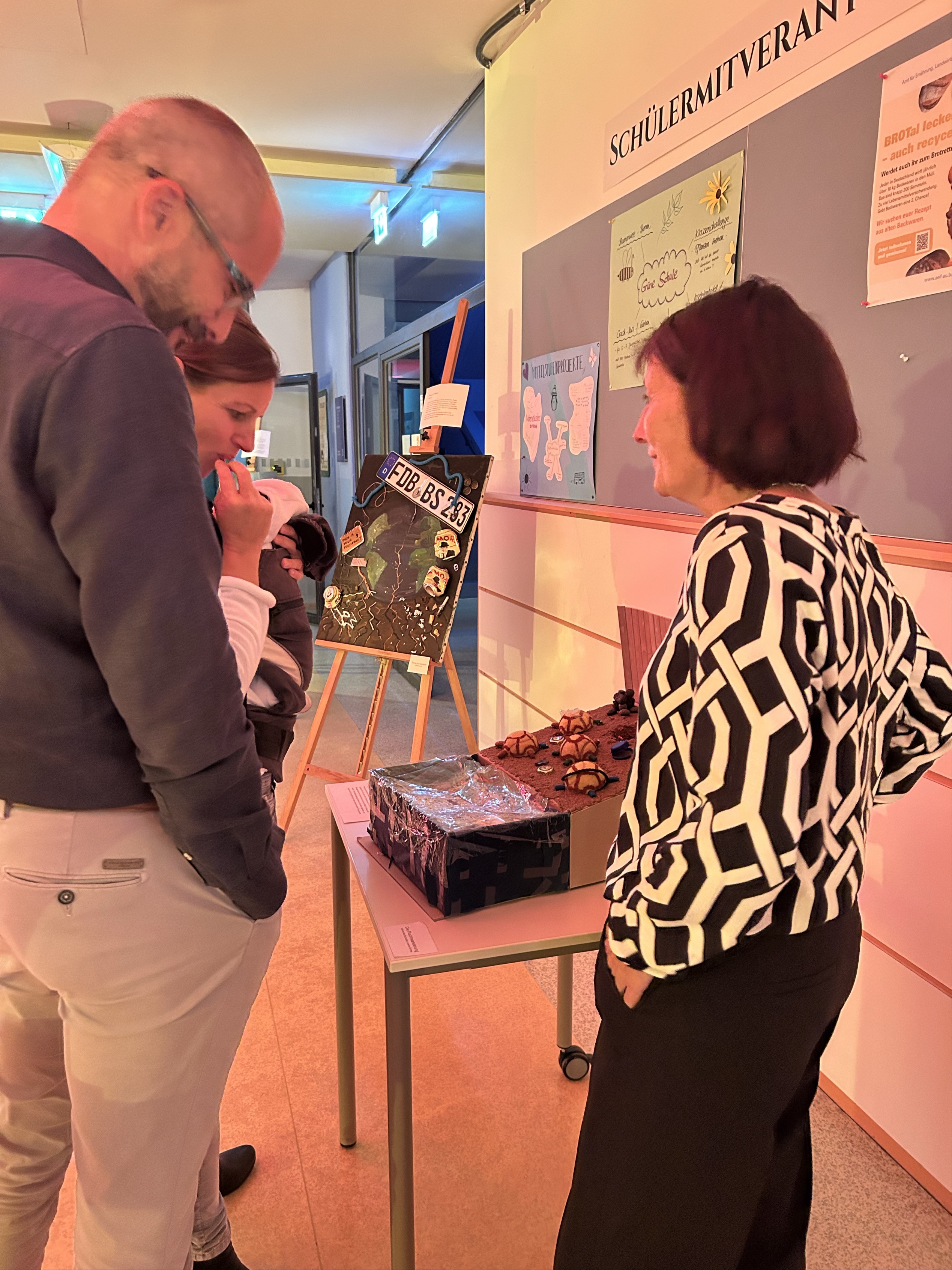 Für das leibliche Wohl sorgte ein Too-Good-To-Go-Buffet mit selbstgemachten Häppchen, Schokobananen und Kuchen, ausgegeben gegen eine freiwillige Spende. Die Organisation und Leitung lagen bei Leon Gerlinger (Jahrgangsstufensprecher), Katharina Schäfer (Jahrgangsstufensprecherin und Leiterin des Kunst-Workshops am Umwelttag) sowie Sabine Weimann (Oberstufenkoordinatorin). Für Licht und Technik sorgten Herr Urbin und Herr Zimmert. Unterstützt wurde das Team von zahlreichen Helferinnen und Helfern der Q13.